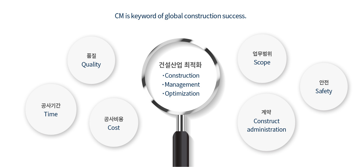 CM(Construction Management)은 건설사업의 공사비절감(Cost), 품질향상(Quality), 공기단축(Time), 안전시공(Safety) 등을